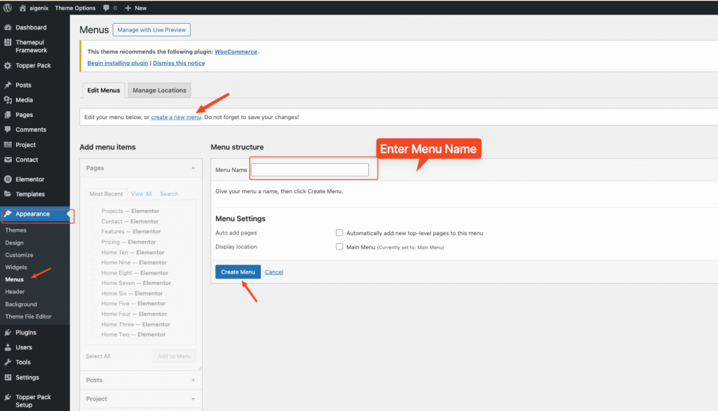 3. Enter a Menu Name (e.g., Main Menu, Footer Menu).