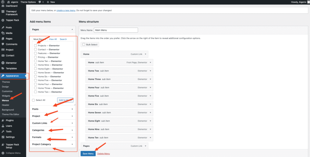 1. Go to your WordPress DashboardAppearanceMenus.